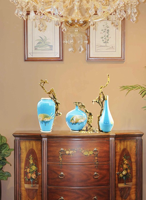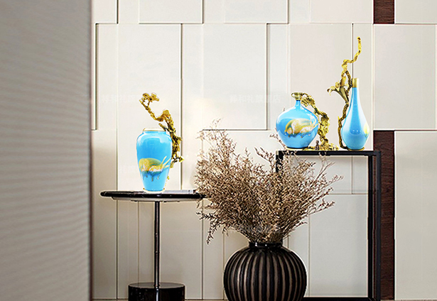 首先給彩瓷加了一個銅底座、銅沿口,然后把熔化后的銅水倒進沙里,形成不同自然形狀后再與彩瓷底座和沿口相連,效果出人意料的好,厚重與輕脆相融,古樸與現(xiàn)代結(jié)合,也不知是瓷攀上了銅,還是銅纏上了瓷。相得益彰,妙不可言。