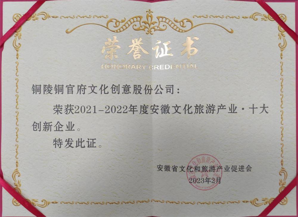 日前,由安徽省文化和旅游產(chǎn)業(yè)促進(jìn)會(huì)(省文促會(huì))主辦的第二屆安徽文化旅游產(chǎn)業(yè)2021-2022年度頒獎(jiǎng)盛典暨新春聯(lián)誼會(huì)活動(dòng)在合肥舉行,2021-2022 年度“七個(gè)十”榜單公布。銅陵銅官府文化創(chuàng)意股份公司榮獲“2021-2022年度安徽文化旅游產(chǎn)業(yè) · 十大創(chuàng)新企業(yè)”,公司創(chuàng)始人趙敏榮獲“2021-2022年度安徽文化旅游產(chǎn)業(yè) · 十大榜樣人物”。